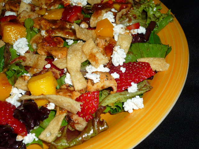 My Strawberry-Mango Chicken Salad combines diced strawberry and mango over a base of field greens, for a slightly tropical feel. I had some chipotle marinated chicken chunks in the freezer, so I grilled them up. Add in some candied nuts, creamy feta and crunchy wonton strips...and it was a salad so heart that it satisfied Michaels manly appetite.